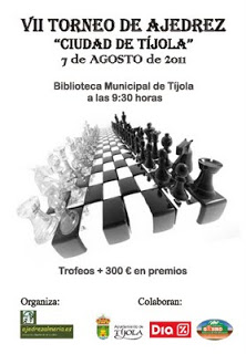 Otras Noticias VII TORNEO DE AJEDREZ «CIUDAD DE TIJOLA» CLASIFICACION FINAL VII TORNEO CIUDAD DE TIJOLA ORGANIZACIÓN. El Torneo será organizado por la delegación almeriense de ajedrez en colaboración con el excmo. Ayuntamiento de Tijola. PARTICIPANTES. Abierto a todo tipo de jugadores y edades. SISTEMA DE JUEGO. Suizo a 5-6 rondas según participantes. · Ritmo de juego 15 minutos + 5 segundos adicionales a finish. · Emparejamiento: Gestión Informática del Programa Swiss Manager. LUGAR DE JUEGO. Biblioteca Municipal de Tijola. ( Bajos de la casa Cultural Fidela Campiña ). FECHAS Y HORARIO. Domingo 7 Agosto a las 9.30H INSCRIPCIONES . Gratuita en el lugar del torneo hasta 30 minutos antes del comienzo. PREMIOS: · 1er clasificado 100 € + trofeo · 2º clasificado 70 € + trofeo · 3er clasificado 50 € + medalla · 4º clasificado 30 € + medalla · 5º clasificado 20 € + medalla Premio especial al primer clasificado local 30 € + Trofeo. Premio especial al primer clasificado local sub 16, Medalla.Más información e inscripción : antoniotijola@hotmail.com