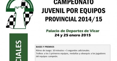 Juvenil por Equipos Indalo Nacex campeón del Juvenil por Equipos 10 septiembre 2016 Roquetas El pasado sábado 10 de septiembre se disputó en Roquetas el Campeonato Provincial Juvenil Por Equipos 2015/2016, con la presencia de Equipos de los clubs Benahadux, Indalo, Roquetas y Vicar. El campeón fue el equipo Indalo Nacex de Almería, seguido de Roquetas con los mismos puntos y Vicar tercera. También se hizo entrega de un libro a cada uno de los mejores tableros: Salvador Perez (primer tablero), Ciro Revaliente (segundo), David Cabrera (tercero) y Angel Vico (cuarto). Clasificación final y resultados: www.chess-results.com