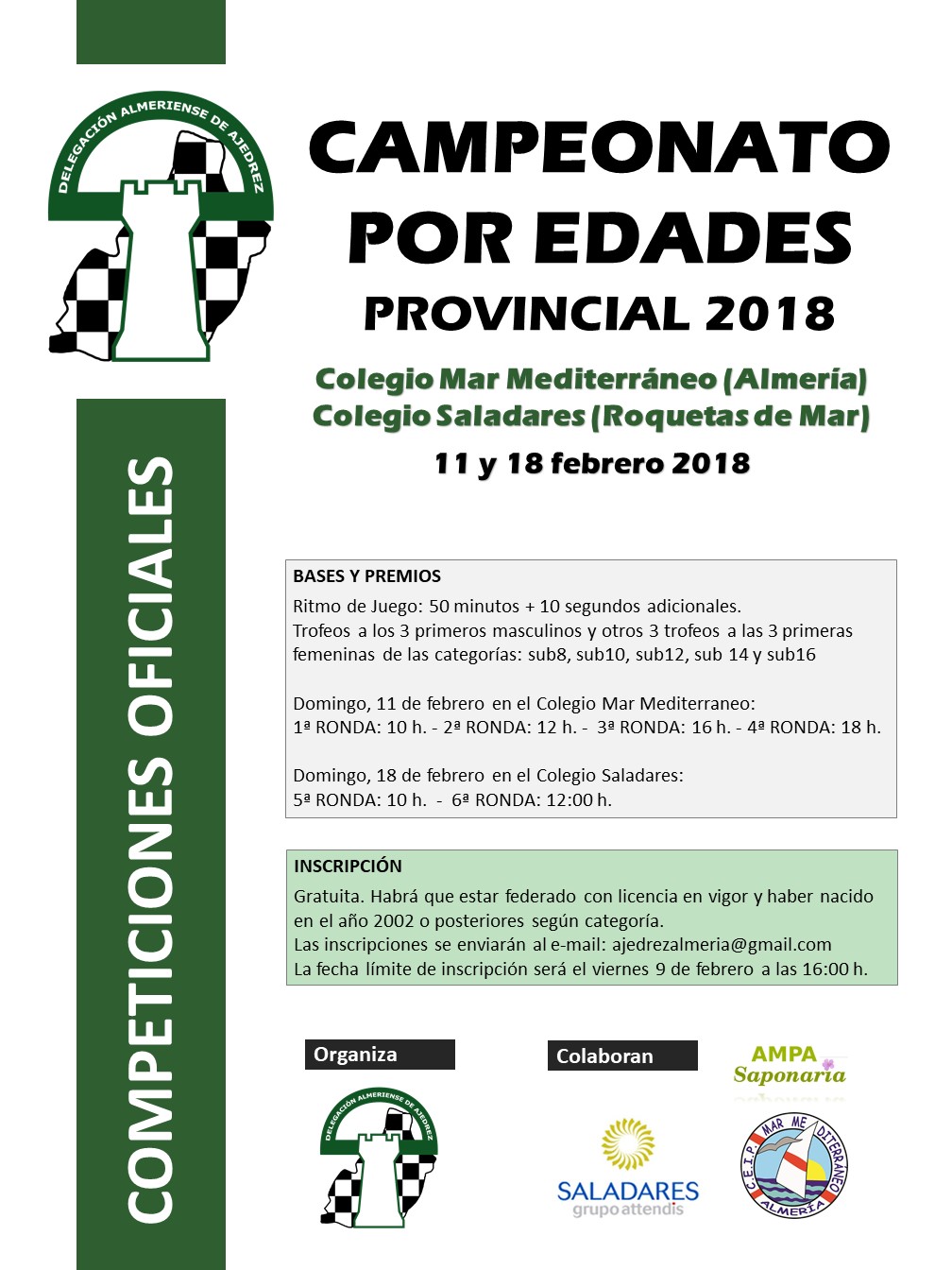 Organiza la Delegación Almeriense de Ajedrez. Colaboran el  CDP Saladares, CEIP Mar Mediterraneo y el AMPA Saponaria.