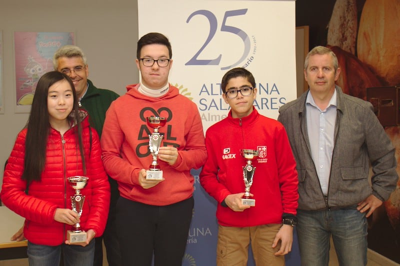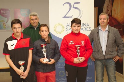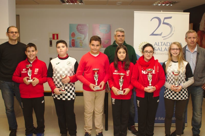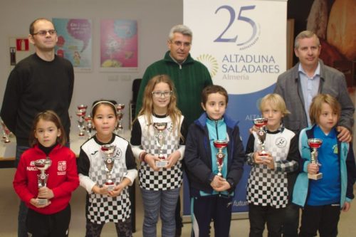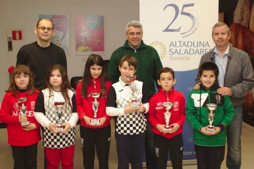 Actualidad Edades Edades Sub 08 Edades Sub 10 Edades Sub 12 Edades Sub 14 Edades Sub 16 Campeones de Almeria por Edades sub 08 a sub16 2018 11 y 18 febrero Almeria y Roquetas Los domingos 11 y 18 febrero se han disputado las 6 jornadas del Campeonato Provincial de Jovenes Promesas para jugadores federados de en las categorias Prebenjamin, Benjamin, Alevin, Infantil y Cadete. Han participado más de 60 niños y niñas de 5 a 16 años de edad. El campeonato tuvo su inicio el domingo 11 de enero en el Colegio Mar Mediterráneo de la ciudad de Almería, jugándose 4 rondas y ha finalizado el domingo 18 con otras dos rondas en el Colegio Saladares de Roquetas de Mar. Los jugadores que se llevaron trofeos han sido los siguientes: Categoría PreBenjamín Campeón Masculino y absoluto: David Jiménez Freniche (Club El Rey) SubCampeón Masculino: David Sabau (Club de Roquetas) Tercero Masculino: Hugo Guillen Martínez (Rey de Huercal) Campeona Femenina: Ekaterina Valdivia Khudiakova (Roquetas) SubCampeona femenina: Arailym Mukhtarkhan (Club de Roquetas) Tercera Femenina: Natalia Portero Bravo (Club Ajedrez Indalo) Categoría Benjamín Campeón Masculino: Dario Raya Hidalgo (Club de Roquetas) SubCampeón Masculino: David Del Aguila Paris (Club Ajedrez Indalo) Tercero Masculino: Javier Latre Rodríguez (Circulo Mercantil Almeria) Campeona Femenina: Alba Barranco Lopez (Club Ajedrez Indalo) SubCampeona femenina: Angie Sicilia Laino (Club de Roquetas) Tercera Femenina: Sandra Hernandez Lopez (Club Ajedrez Indalo) Categoría Alevín Campeona Femenina: Aitana Portero Bravo (Club Indalo Almería) SubCampeona femenina: Claudia Mullor Peña (Club Indalo Almería) Tercera Femenina: Yulia Valdivia Khudiakova (Club de Roquetas) Campeón Masculino: Alvaro Garcia Bellido (Club El Ejido) SubCampeón Masculino: Juan Diego Sicilia Laino (Club de Roquetas) Tercero Masculino: Jose Manuel Morales Carmona (Club Indalo Almería) Categoría Infantil Campeón Masculino: David Llena Velarde (Club Ajedrez Frigan) SubCampeón: Jose Manuel Perez Jimenez (Club de Roquetas) Tercero Masculino: Alberto Javier Amate Sanchez (Club Indalo Almería) Categoría Cadete Campeón Masculino: Francisco Merelo Garcia (Club de Roquetas) SubCampeón Masculino: Jose Torres Lopez (Club Indalo Almería) Campeona Femenina: Laura Wang Qiu (Club Indalo Almería) Las clasificaciones finales y resultados se pueden consultar en: www.chess-results.com