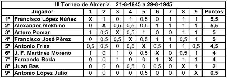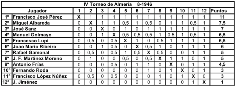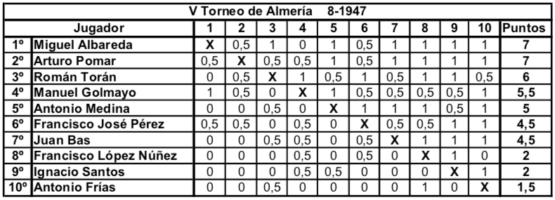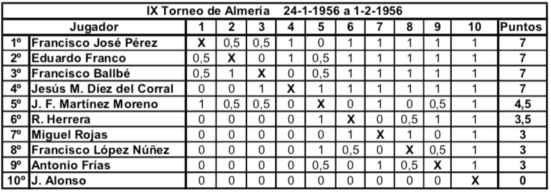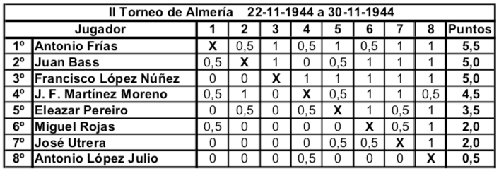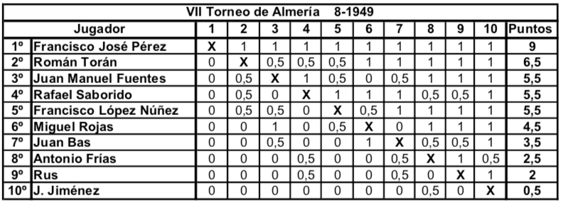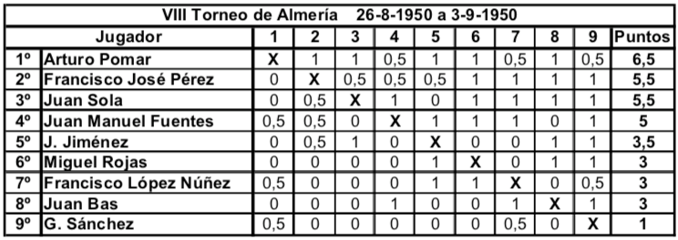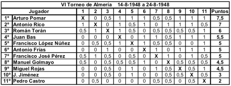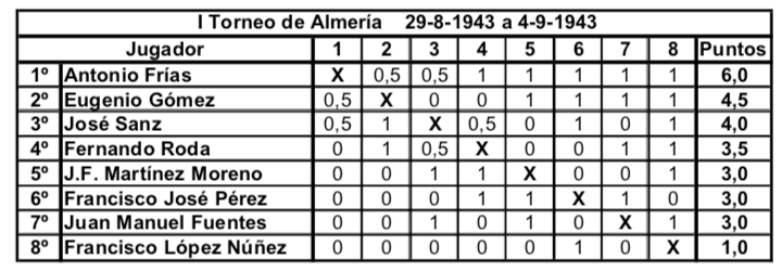 Actualidad Otras Noticias Almería y los primeros torneos nacionales de ajedrez Junio 2018 Almeria Pedro Jesús Ferrer Sánchez, Junio de 2018. En España, en el año 1942 la actividad ajedrecística comienza a regularizarse tras la Guerra Civil. Se celebra el primer Campeonato Nacional desde 1935 y Ramón Rey Ardid, campeón durante 12 años, retiene el título ante Juan Manuel Fuentes. En 1943 y de forma inesperada José Sanz se lo arrebata. Esto hace que Rey Ardid se retire de la práctica activa del ajedrez en beneficio de sus otras labores profesionales. En Almería, Antonio Frías Giménez organiza la Federación de Ajedrez, y es en Agosto de 1943 cuando da comienzo el primero de ocho torneos anuales, que podríamos considerar son los años de oro del ajedrez almeriense. De 1943 hasta 1950 se dieron cita en Almería jugadores de categoría nacional con la excepcional participación del campeón del mundo en 1945. Se trataba de torneos por sistema liga y entre ocho y doce participantes. Normalmente se realizaban a final de agosto coincidiendo con las fiestas patronales de la ciudad, disputándose las partidas en el Círculo Mercantil y el Casino Cultural. Pocas ciudades, quizás Madrid, Barcelona y Gijón, llegaron a tener estos años torneos de tal categoría y continuidad. Es por lo que Almería se convirtió en una de las citas ineludibles del panorama ajedrecístico español, y todos los grandes jugadores pasaron uno o varios años por tierras almerienses. En este primer torneo de 1943 venció con claridad el gran jugador almeriense Antonio Frías, seguido del sevillano Eugenio Gómez y el vigente Campeón de España José Sanz. Otros fuertes jugadores fueron el tres veces Campeón Nacional Francisco José Pérez y el varias veces subcampeón Juan Manuel Fuentes. Completaban la nómina los almerienses Francisco López Núñez, el Dr. José Fausto Martínez Moreno y Fernando Roda. Imagen de Antonio Frías Giménez en una de sus participaciones en el Campeonato de Andalucía Oriental a principios de los años 40. Precursor y organizador de los primeros torneos nacionales en Almería, participó en ocho de los nueve torneos celebrados, siendo ganador en las dos primeras ediciones del torneo. En 1944 se pretendía contar con la presencia en el torneo del niño prodigio español Arturo Pomar que por entonces aún no había cumplido los trece años. Fue uno de los mejores jugadores españoles de la historia, quedando siete veces Campeón de España. Ese año no se pudo conseguir su participación y se optó por realizar solo un fuerte torneo de carácter regional que vio triunfar por segunda vez a Antonio Frías seguido de los almerienses Juan Bass y López Núñez. Completaron la tabla los malagueños Pereiro, Utrera y los almerienses Martínez Moreno, Miguel Rojas y Antonio López Julio. Desde 1944 el campeón del mundo Alexander Alekhine se encontraba en España huyendo de la guerra en Europa. Así que en el torneo de 1945 se consiguió la participación de Alekhine y su pupilo, el niño prodigio Arturo Pomar. La clasificación final muestra la sorprendente victoria del almeriense Francisco López Núñez empatado a puntos con Alekhine, pero victoria particular y mejor desempate para el jugador local. Tras el tercero, Arturo Pomar, completaron la clasificación Francisco José Pérez y los almerienses Antonio Frías, Martínez Moreno, Fernando Roda, Juan Bas y Antonio López Julio. Imagen aparecida en la prensa de la época de Francisco López Núñez cuando en 1945 ganó el Torneo Internacional de Almería. Único participante en las nueve ediciones celebradas del torneo. En el torneo de 1946 cesa la racha ganadora de los jugadores almerienses y es Francisco José Pérez quien gana el torneo con una victoria inapelable y once puntos sobre once partidas. Segundo fue el subcampeón nacional del año anterior Miguel Albareda, seguido del excampeón José Sanz. Completaron la clasificación; Manuel Golmayo que fue Campeón de España de 1902 a 1930, los portugueses Francisco Lupi y Joao Ribeiro, el fuerte jugador madrileño Rafael Gamonal y los almerienses Martínez Moreno, Antonio Frías, Fernando Roda, López Núñez y Jiménez. En 1947 son Miguel Albareda y Arturo Pomar los que ocupan empatados las dos primeras posiciones. Pomar que ganó el Campeonato de España en 1946 con menos de 15 años es ya un jugador consagrado. Tercero es el nuevo valor y futuro Campeón de España Román Torán. Les siguen Manuel Golmayo y el vigente Campeón de España Antonio Medina. Francisco José Pérez, ganador de la edición anterior, solo consiguió la sexta plaza. La parte baja de la tabla la ocupan los almerienses Juan Bas, López Núñez, Ignacio Santos y Antonio Frías. La labor de organizativa de Antonio Frías le hizo perder muchos enteros en las clasificaciones de estos torneos, tal y como ocurrió este año. 1948 ve por fin el triunfo en solitario del aún niño Arturo Pomar, seguido del fuerte jugador asturiano Antonio Rico, siendo tercero Román Torán. Los almerienses Juan Bas, López Núñez y Antonio Frías se sitúan por delante del vigente Campeón de España Francisco José Pérez y Manuel Golmayo. Cierran la tabla el resto de almerienses; Miguel Rojas, J. Jiménez y Pedro Castro. Vuelve en 1949 Francisco José Pérez a realizar el 100% de los puntos, hazaña que solo ha realizado este jugador en dos ediciones 1947 y 1949. En segundo lugar queda Román Torán, seguido de Juan Manuel Fuentes y Rafael Saborido, subcampeón nacional el año anterior. Los almerienses ocupan los siguientes lugares; López Núñez, Miguel Rojas, Juan Bas, Antonio Frías, Rus y J. Jiménez. Segundo triunfo de Arturo Pomar, vigente Campeón de España, en 1950. Le siguen Francisco José Pérez y el catalán Juan Sola. Tras Juan Manuel Fuentes se situaron los almerienses Jiménez, Miguel Rojas, López Núñez, Juan Bas y Sánchez. En esta edición no pudo participar Antonio Frías por problemas familiares.