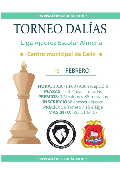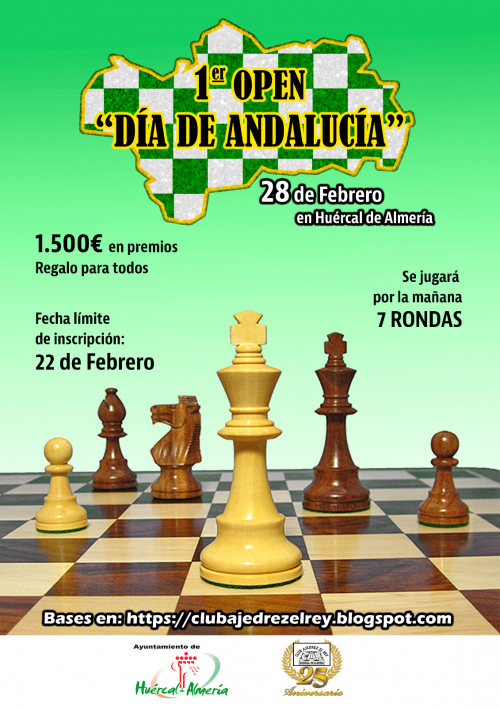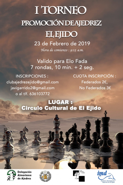 Otras Competiciones Próximas Competiciones Próximas Competiciones ELO Próximos torneos Febrero de 2019 Febrero 2019 Además de los torneos oficiales que se van a disputar este mes, el campeonato provincial por edades y la Copa de Andalucía, os informamos de la oferta de torneos que se van a disputar en la provincia en las próximas semanas: 16 de Febrero Torneo Chesscuela DalíasTorneo escolar, no válido ELO. Encuadrado en la Liga de Ajedrez de Chesscuela, constará de 4 torneos que se disputarán en las localidades de Dalías(16 febrero), Adra(24 marzo), Berja (27 abril) y Laujar(11 mayo) 23 de Febrero I Torneo de Promoción del Ajedrez, El EjidoOrganizado por el Club Ajedrez El Ejido, será válido para ELO FADA, a ritmo de 10’+2» 28 de Febrero 1er Open Día de AndalucíaOrganizado por el Club Ajedrez el Rey, no es válido para ELO FADA y se jugará a ritmo de 10’+2». Bases