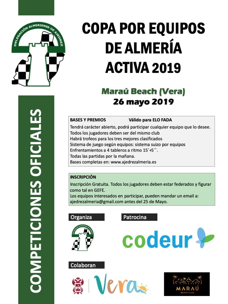 Copa por Equipos Otras Noticias Copa por Equipos de Almería Activa 2019 26 mayo 2019 Vera La delegación ha organizado con el patrocinio de Codeur y la colaboración del Ayuntamiento de Vera en el Restaurante Maraú de Vera (Av. Descubrimiento s/n) la Copa por Equipos de Almería Activa 2018 para el próximo 26 de mayo a las 10 horas. Las bases son las siguientes: Tendrá carácter abierto, podrá participar cualquier equipo que lo desee.Inscripción gratuita.Todos los jugadores deben ser del mismo club.Todos los jugadores deben estar federados y figurar como tal en GEFE.La sede será el Restaurante Maraú Beach de Vera.La Delegación entregará a cada club participante 5 vales de comida (independientemente del número de equipos y a repartir como estimen conveniente). Tendrán que especificar cuantas personas se quedan a comer cuando se realice la inscripción. Las reservas extras se abonarán en la sede del torneo antes de comenzar la primera ronda, a razón de 15 euros por persona.Torneo válido para ELO FADA.Habrá trofeos para los tres equipos mejores clasificados.Sistema de juego según equipos: si el número de equipos es mayor de 7, se competirá por el sistema suizo de equipos.Enfrentamientos a 4 tableros a ritmo 15´+5´´. Todas las partidas por la mañana.Alineación ordenada por ELO FADA (Habrá 50 puntos de tolerancia para el orden).Puede haber cuántos suplentes se quiera, pero deben estar registrados previamente al inicio de la competición.Desempates: Buchholz (-1), Buchholz Total y enfrentamiento directo. En las fases finales, se jugará otra partida a 3´+2´´ cambiando los colores, de persistir el empate, se tendrá en cuenta el sistema Holandés. Los equipos interesados en participar, pueden mandar un email a: ajedrezalmeria@gmail.com antes del 25 de mayo.