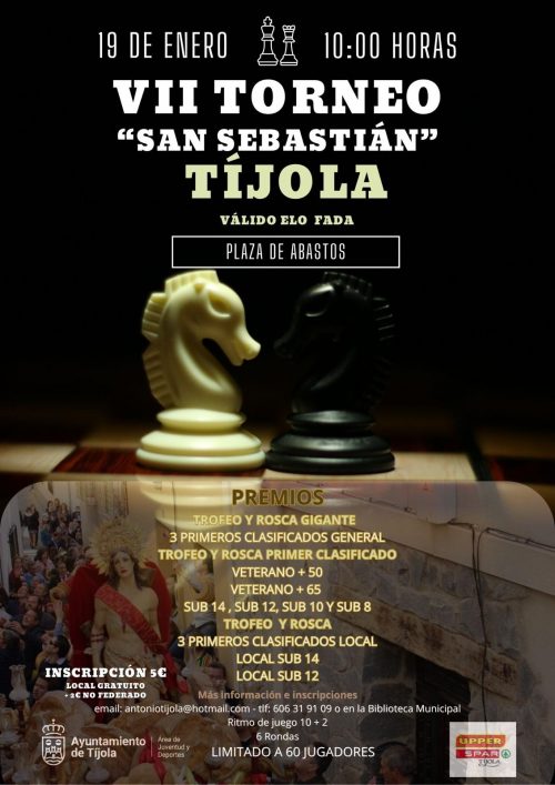 El torneo se celebrará el día 19 de enero a las 10:00 en la Plaza de Abastos de Tíjola. Limitado a 60 jugadores.