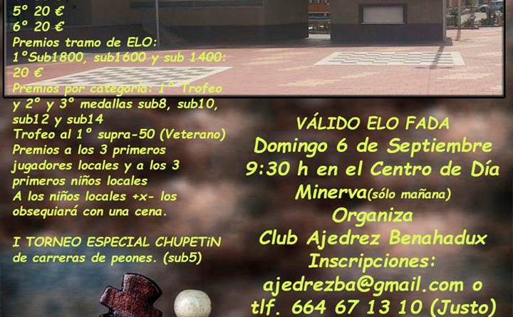 Próximas Competiciones ELO IV Torneo de Ajedrez de Benahadux 2015 6 septiembre 2015 Benahadux LISTA PROVISIONAL DE INSCRITOS: www.chess-results.com BASES 1. ORGANIZACIÓN El Torneo está organizado por la Escuela de Ajedrez de Benahadux con la... Read more