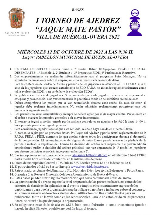 Están disponibles el cartel y bases del torneo que se celebrará el 12 de octubre en Huércal-Overa.