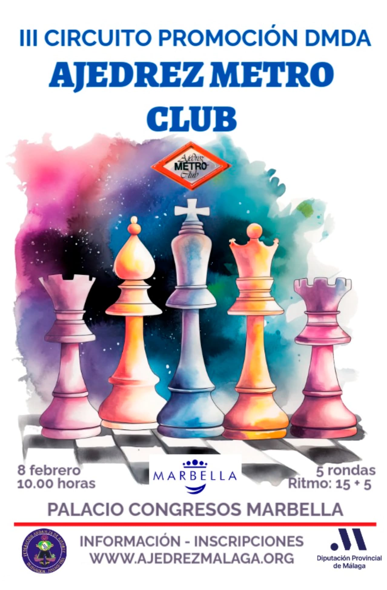 Más información en la web de la delegación malagueña de ajedrez. https://www.ajedrezmalaga.org/torneos/2025/1/24/torneo-promocion-marbella-amc-ajedrez-metro-club-marbella/